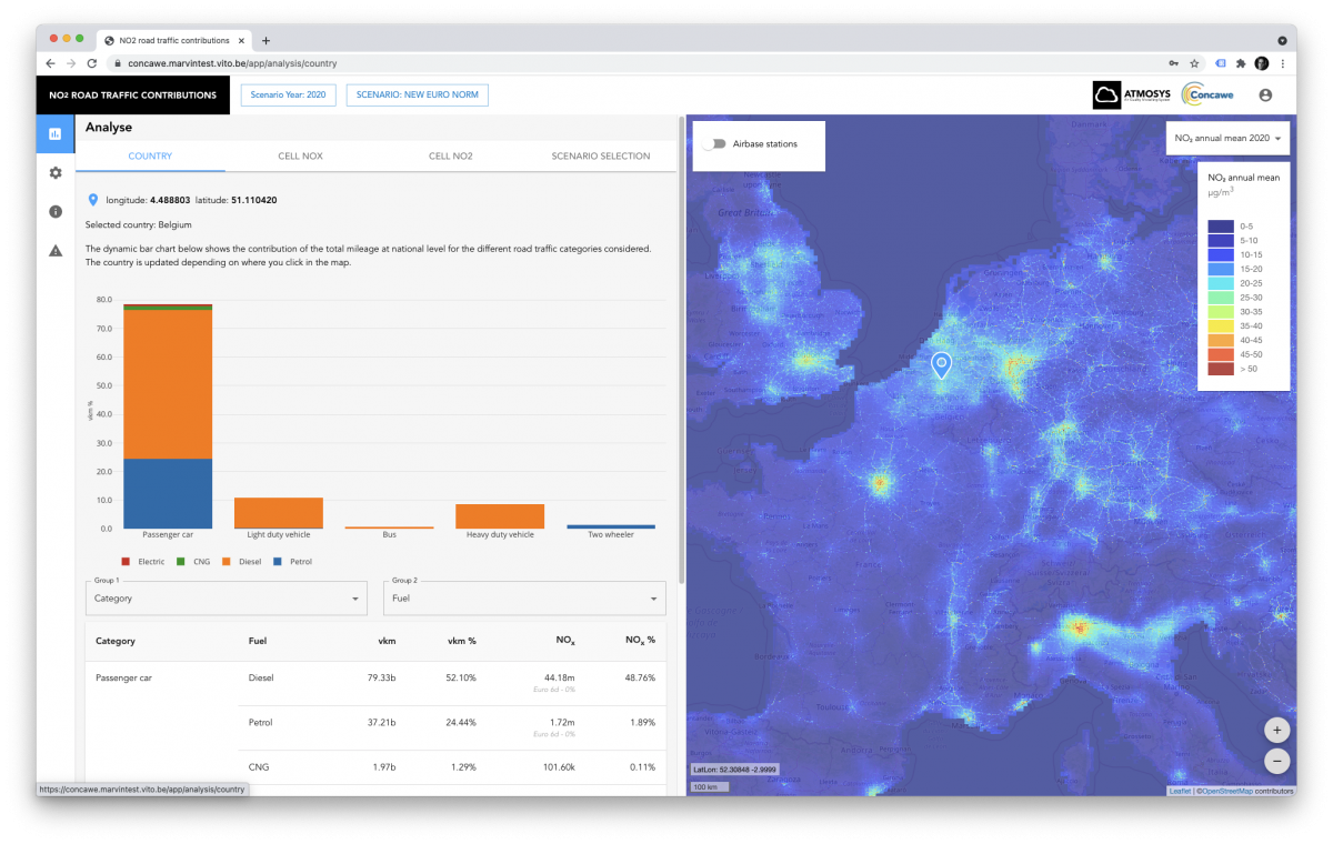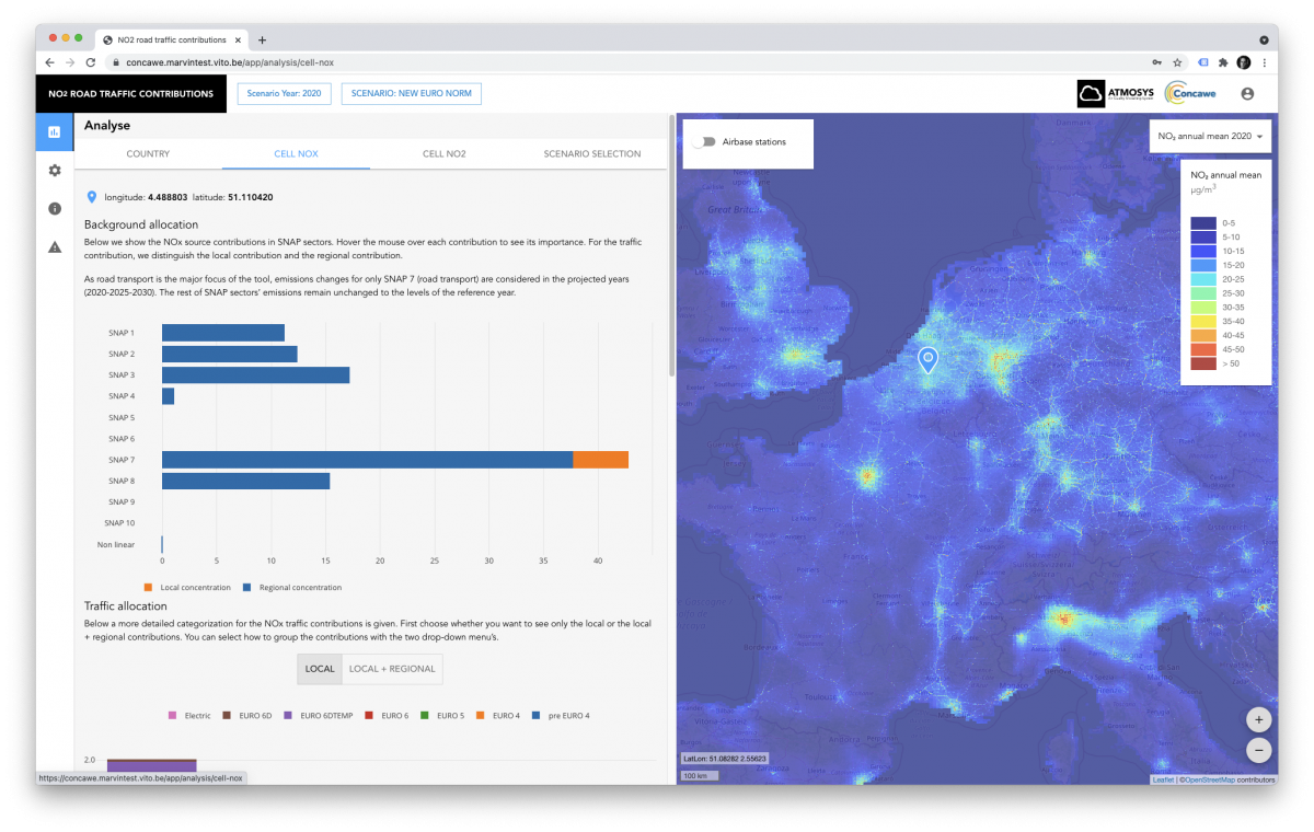 CONCAWE approached VITO in 2017 to develop an EU-wide interactive source apportionment tool for their members that would allow them view the contribution of the NOx emissions from various vehicle categories and fuel types on the NO2 levels everywhere in Europe. VITO was in a unique position to offer this service as the MAP team had just developed QUARK (Quick Urban AiR quality using Kernels) which allows fast modelling of NO2 levels across all of Europe down to street level. The resulting web application contains baseline data for 2014 and 2015 and future years, 2020, 2025 and 2030.